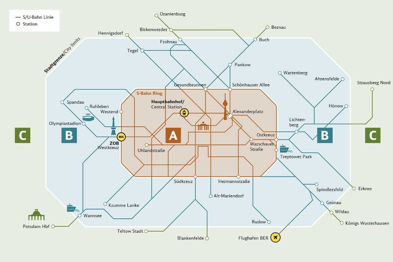 The public transport system is divided into three zones: A (center), B (first ring) and C (second ring), as shown in the picture below. Most destinations you will travel to in Berlin will be in the A or B zone and require an AB ticket. The BER Airport is located in zone C.